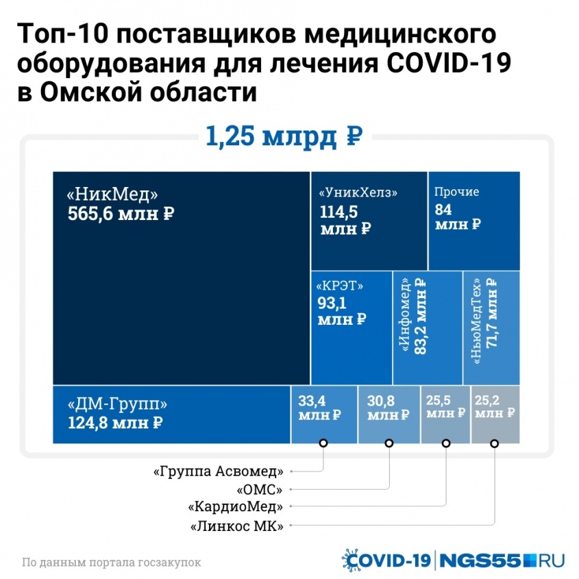 Из омских компаний на пандемии удалось относительно хорошо заработать ООО «ОМС» братьев Обгольц. Фирма как единственный поставщик получила 18 контрактов на сумму 30,8 миллиона рублей. Оборудование поступит не только в городские, но и в районные больницы, где также начали оборудовать ковидные койки. В целом в Омске осталось меньше 6% от 1,25 миллиарда рублей — всего 73,4 миллиона рублей.