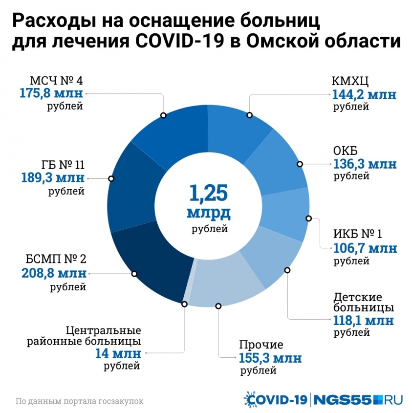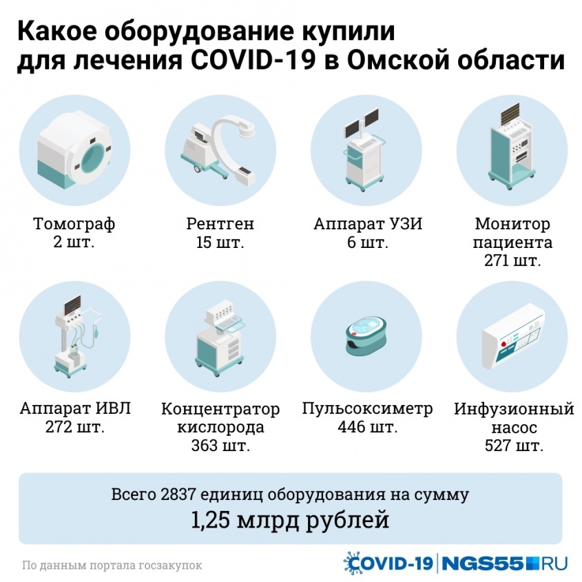По данным портала госзакупок, всего в Омской области с 1 апреля было заключено 111 контрактов с единственным поставщиком на поставку медицинского оборудования для ковидных стационаров. Их сумма превысила 1,25 миллиарда рублей. Добавим, что в середине апреля на развертывание инфекционных коек пришел второй транш из федерального бюджета в размере 212 миллионов рублей, так что из регионального доплачивать не пришлось.