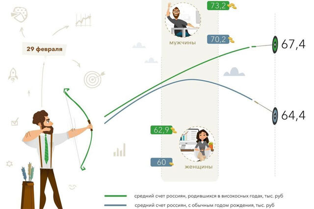 По данным исследования, средний счет застрахованного лица составляет 64,4 тысячи рублей, а у тех, кому повезло родиться в високосном году, – 67,4 тысячи рублей. «Средний счет мужчин високосного года рождения составил 73,2 тысячи рублей, и это примерно на 3 тысячи рублей больше среднего счета мужчин «обычного» года рождения. Средний счет женщин обычного года рождения равняется 60 тысяч рублей против 62,9 тысячи рублей у женщин високосного года рождения», – уточняется в отчете.