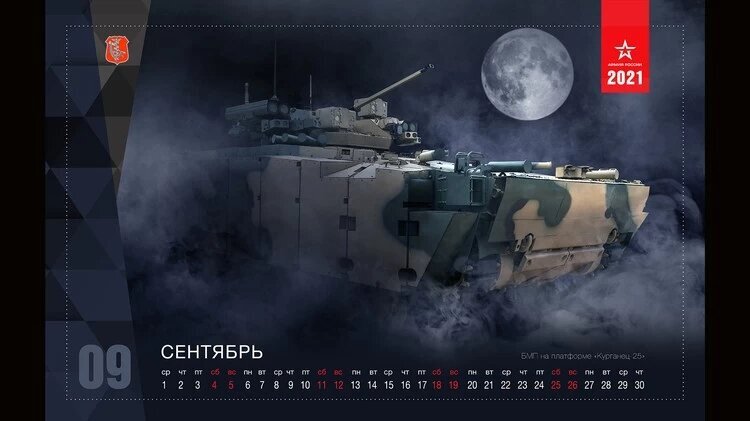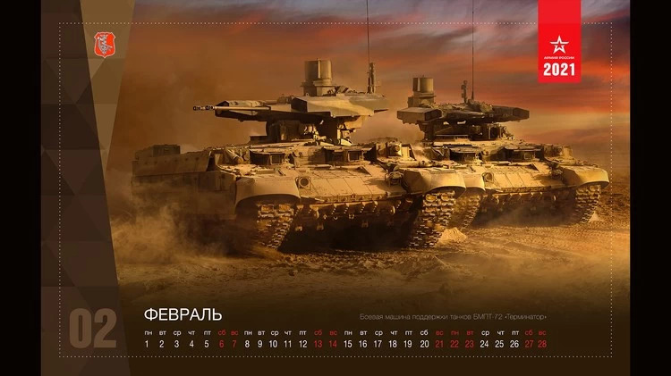 Январь представлен снимком новейшего малозаметного в небе для средств противовоздушной обороны противника многофункционального истребителя Су-57, февраль — новой боевой машиной поддержки танков БМПТ-72 «Терминатор», а март — тяжелым многофункциональным беспилотником БПЛА «Охотник».