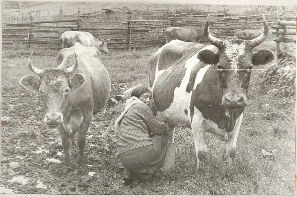 Крупнорогатый скот в загоне. Шорская девушка доит корову. Утренняя дойка