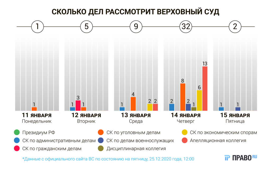 На последней неделе уходящего 2020 года Верховный суд запланировал всего девять разбирательств. Они пройдут в коллегии по уголовным делам и коллегии по делам военнослужащих.