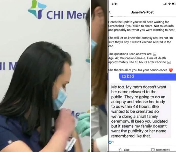 Вопросы, на которые я могу ответить: Возраст: 42 года, Белая женщина. Время смерти примерно через 8-10 часов после вакцинации. Она благодарит всех вас за соболезнования. Так плохо мне тоже. Моя мама не хочет, чтобы ее имя стало достоянием общественности. Они собираются сделать вскрытие и передать нам ее тело в течение 48 часов. Она хотела, чтобы ее кремировали, поэтому мы проводим небольшую семейную церемонию. Я буду держать вас в курсе событий, но, похоже, моя семья не хочет, чтобы ее имя запомнили так."