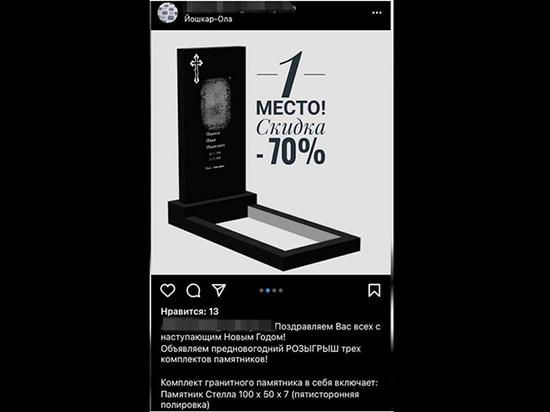 А тем временем в Йошкар-Оле розыгрыш новогодних скидок объявили… установщики могильных плит! Принять участие в конкурсе может любой, кто подпишется на их инстаграм-аккаунт с надгробиями. Победителями станут трое подписчиков, поставившие замогильной страничке больше всего лайков и сделавшие больше всех репостов. В качестве призов они получат скидки на надгробия от 30 до 70%, при условии, что воспользуются ими не позже мая 2021-го. Также всем победителям обещаны скидки на виртуальные поминки с трансляцией в соцсети.