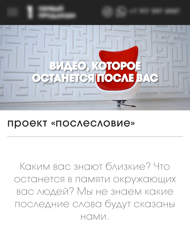 Возможность обратиться к близким, друзьям, соратникам и даже недругам уже с того света всем желающим предоставляет студия видео-продакшна, активно рекламирующая в соцсетях услугу создания профессионального ролика, в котором заказчик даст свое последнее (а может, даже первое и последнее) в жизни интервью.