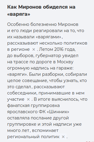 Вскоре даже сам Миронов стал ассоциировать себя с комедийным персонажем. Когда в 2018 году в прокат вышел сатирический сериал про мэра-коррупционера «Домашний арест», съемки которого частично проходили в Ярославле, губернатор даже устроил разбор полетов, решив, что это политический заказ.