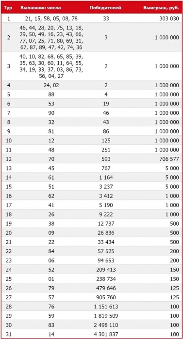В первый день нового 2021 года игра завершилась после 87-го хода. В мешке ведущего в конце остались три бочонка с номерами. Сегодня выиграл каждый третий купленный лотерейный билет. Также была разыграна вся сумма праздничного тиража, более чем в два миллиарда рублей. Тысячи победителей встретят этот новый год более богатыми.