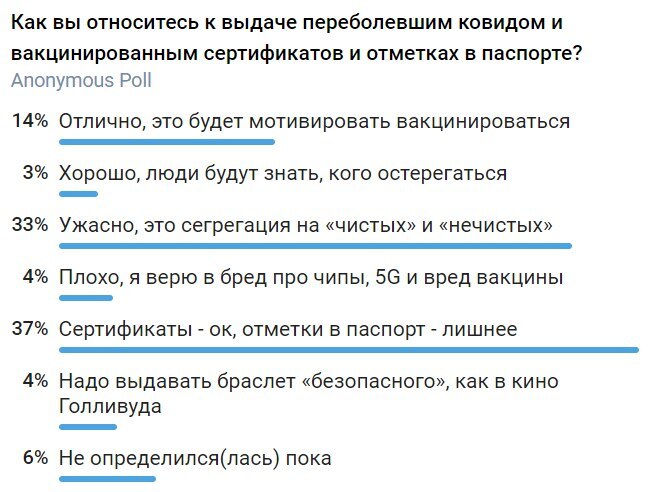 В Телеграм провели опрос на тему отношения к возможной выдаче переболевшим ковидом и вакцинированным специальных сертификатов и отметках в паспорте. Результаты оказались достаточно характерными.