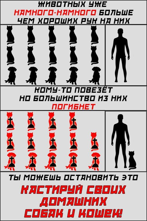 И не хотят понимать такие люди или еще не знают, что если кастрировать 1 кошку или собаку, на свет не появятся сотни никому не нужных бездомышей. И это не только про бездомных. Взятые из дома малыши в «добрые руки», через некоторое время пополняют армию бездомышей в 80% случаев.