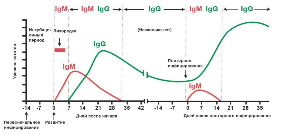На первой неделе после заражения начинают синтезироваться иммуноглобулины класса М (IgM) – это происходит примерно на 3-5 день заболевания. Они первыми встречаются с попавшей в организм инфекцией, и поэтому считаются маркерами острого периода болезни. IgM присутствуют в крови на протяжении первых 2-3 недель, затем постепенно их количество уменьшается.