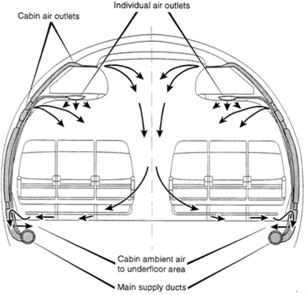 В современных воздушных лайнерах имеется система кондиционирования. Система кондиционирования воздуха — одна из бортовых систем жизнеобеспечения, которая предназначена для обеспечения нормальной жизнедеятельности экипажа и пассажиров. Ниже на рисунке представлено, как движется воздух в салоне самолета.