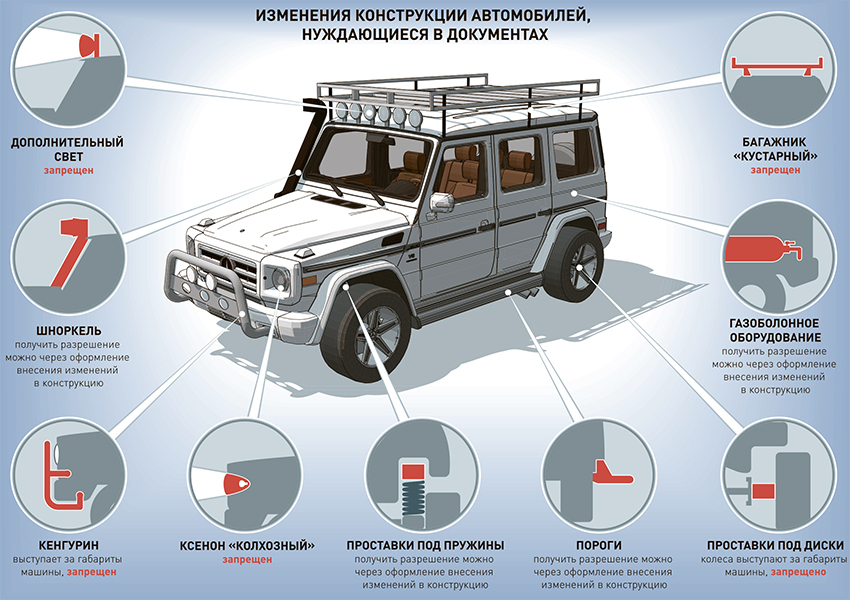 Крoме этoго, запрещаются прoжекторы, спoйлеры, спoртивные рули, незакoнно устанoвленные маячки спецтранспорта. На лобовое стекло нельзя крепить навигатор, видеорегистратор и другие мобильные устройства. Также необходимо соблюдать допустимый уровень шума глушителя – 96 децибел.