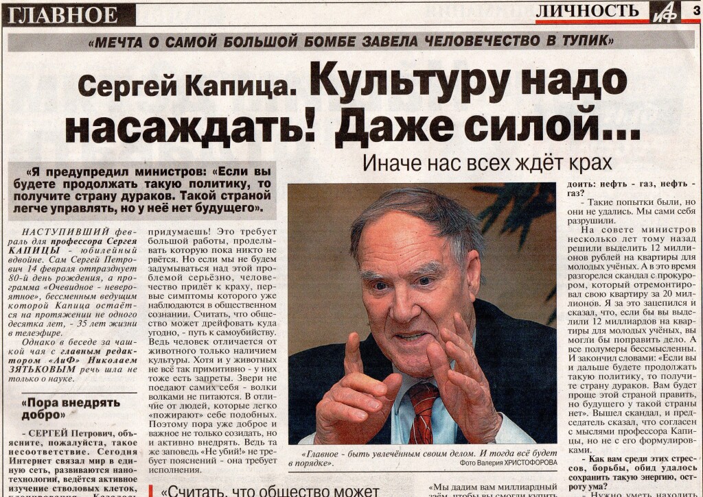Попалась мне тут намедни газета АиФ № 7 от 2008 г. где увидел статью Сергея Капицы которую я прочёл с удовольствием и даже захотелось ей поделиться с вами уважаемые читатели.