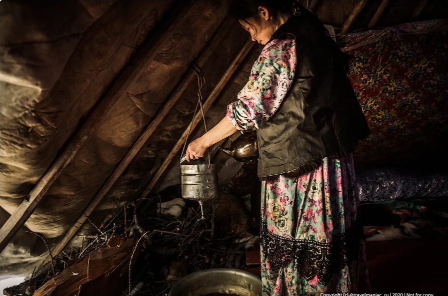 Заходишь в чум, сразу же «захлопываешь» за собой полог, отряхиваешь обувь от снега, снимаешь пуховую куртку: внутри чума натоплено и жарко.