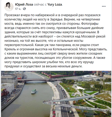 Объектом неудовольствия Лозы стал парящий мост в московском парке Зарядье. Музыканта изумило, сколько людей приходит на этот мост – «убогое сооружение», как назвал его Лоза.