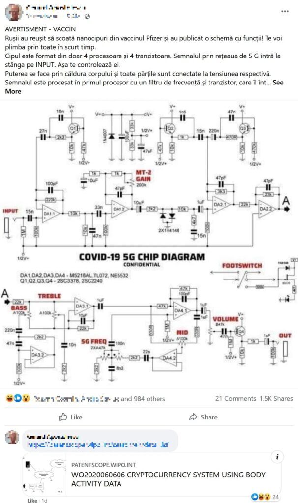 Оригинальное описание изображения гласит, будто бы «русские» смогли извлечь наночипы из вакцины Pfizer и опубликовали эту схему. Автор дал «пояснения» к элементам. По его словам, чип состоит из четырех процессоров и четырех транзисторов. Сигнал от сети 5G поступает на вход слева и таким образом некие «они» контролируют жертву. Питание устройство получает от тепла, генерируемого человеческим телом. Сигнал обрабатывается первым процессором с частотным фильтром и транзистором, который его усиливает.
