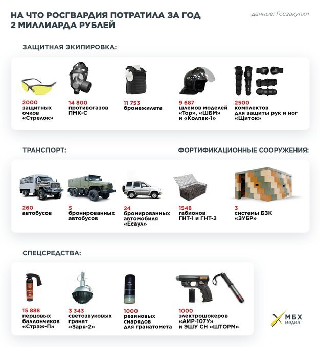 Росгвардия в 2020 году потратила 2 млрд 59 млн рублей на технику, экипировку и спецсредства, которые используются при разгоне протестных акций, сообщает "МБХ медиа" со ссылкой на данные портала госзакупок.