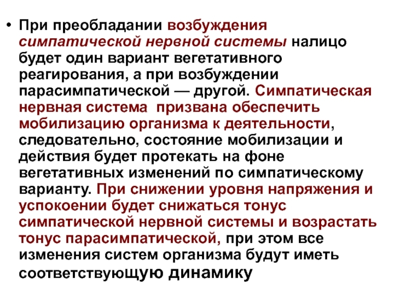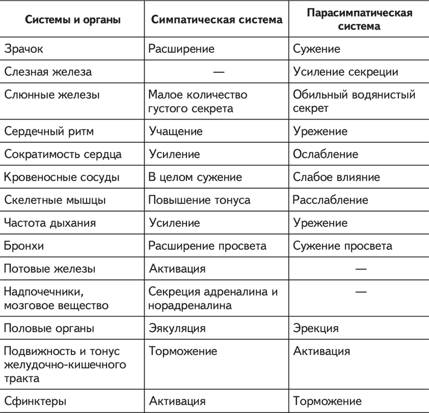 Парасимпатическая и симпатическая системы составляют систему управления (вегетативную систему) отдельными органами человека, при этом симпатическая система отвечает за мобилизацию организма, особенно в стрессовых ситуациях. Парасимпатическая же ориентирована на восстановление организма, расслабление и формирование ресурсов. В итоге должно быть гармоничное взаимодействие.