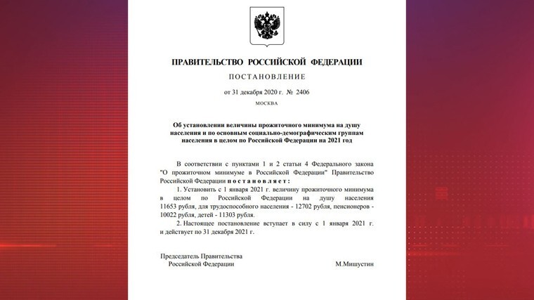 Правительство РФ установило величину прожиточного минимума в стране на 2021 год в размере 11 653 рубля. Как отметили в пресс-службе кабмина, соответствующее постановление подписал премьер-министр Михаил Мишустин.
