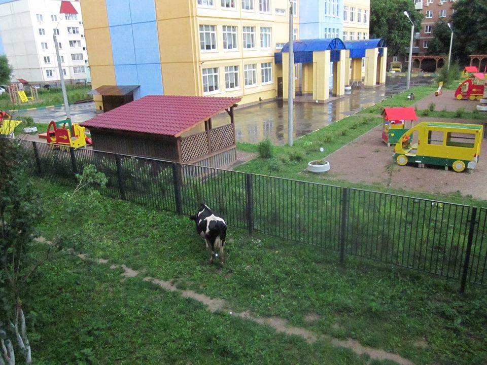 Детский садик, построенный у нас в сельском поселке. Ну а коровка, как элемент сельской атрибутики.