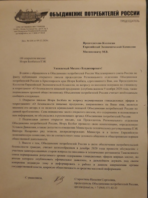Обращение председателя Объединения потребителей России Наталии Сергеевой к председателю коллегии ЕЭК по поводу потребительской безопасности.