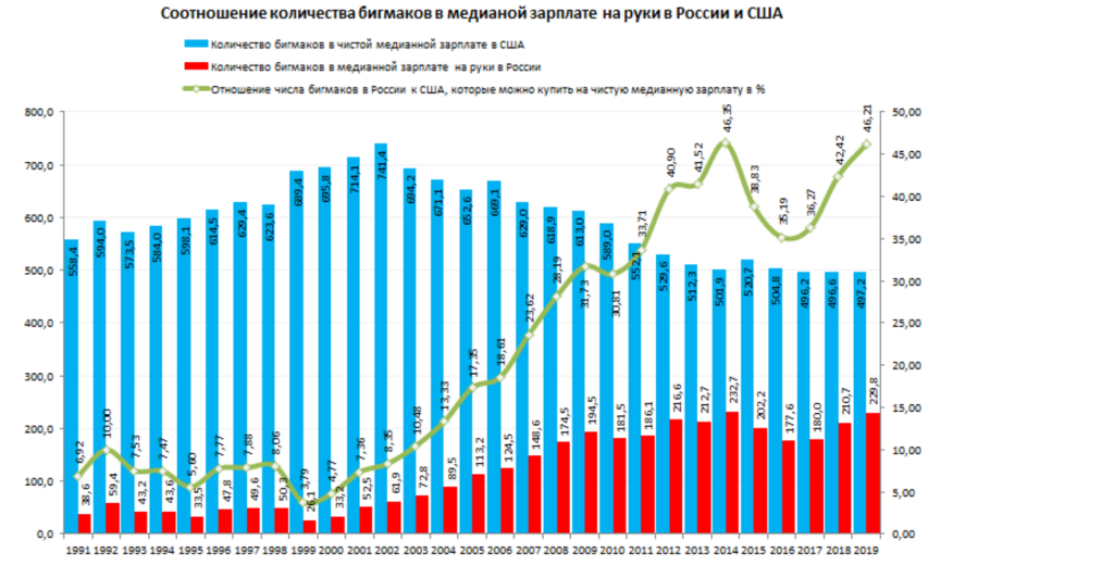 Этот график показывает, как менялось соотношение количества бигмаков, которые можно купить на медианную зарплату на руки в России и США. Бигмак – это такой большой сэндвич, гамбургер, который продают во всемирно известной сети закусочных (рекламировать я её не буду, и так все знают, о чём речь). В западной социологии и экономических исследованиях с лёгкой руки английского журнала The Economist уже несколько десятилетий принято определять с помощью этого индекса соотношение реальной покупательной способности населения в разных странах. Это очень удобно, потому что в разных странах мира этот бутерброд стоит по-разному. В США, например, он гораздо дороже, чем в России.