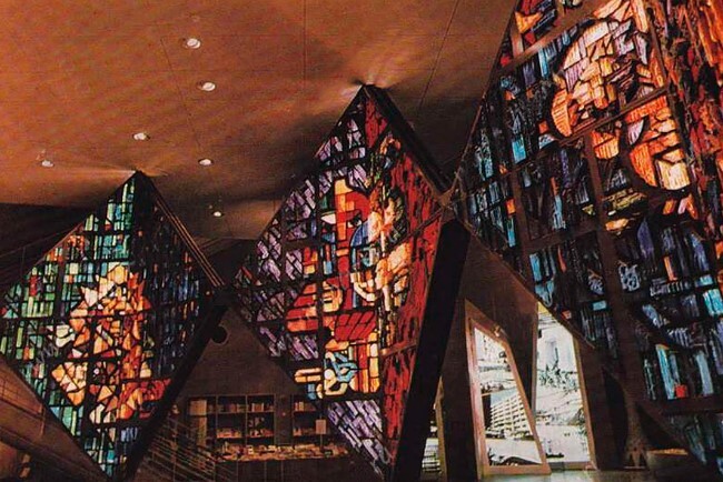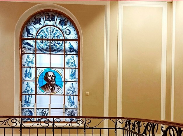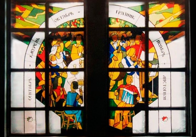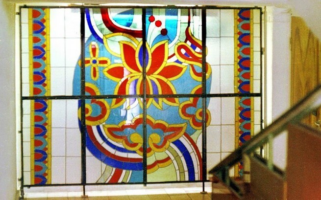 А этот витраж, сделанный из зеркального стекла, был создан литовским художником Моркунасом для центральной аптеки Москвы в 1960 году.