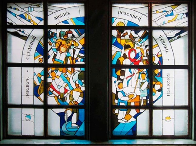 Серия витражей «Времена года» внутри художественно отреставрированного локомотивного завода создана в 1991 году Юрием и Ларисой Утенковыми.