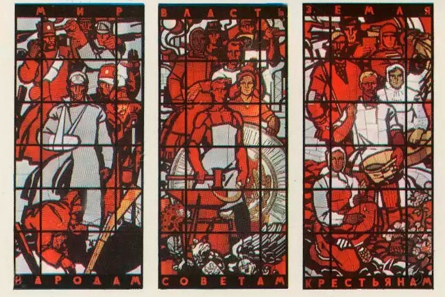 В Советском Союзе даже витражи использовались в качестве художественной пропаганды. Они обращались к массам своими изображениями приземленных предметов: Ленина, солдат Красной Армии, советской символики, рабочих и крестьян.