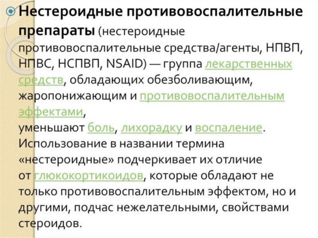 • нестероидные противовоспалительные – Аспирин (в больших дозах), Ибупрофен, Кетопрофен, Парацетамол и пр.;