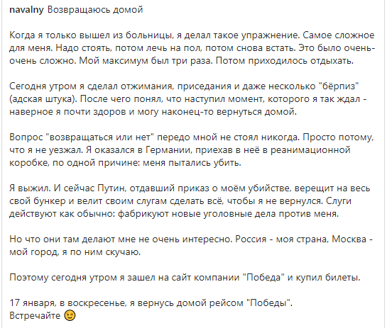 Оппозиционный политик Алексей Навальный заявил, что возвращается в Россию. По его словам, он купил билет на рейс в Москву на 17 января.