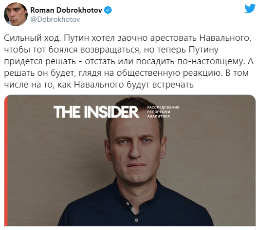Дико правильное и смелое решение Алексея. Более того, супер неудобное для российских властей, которые, конечно же, мечтали о том, чтобы он зассал и остался в Берлине. Но Навальный а) не трус и б) умный парень и прекрасно понимает, что даже если его в отместку отправят за решетку, то из тюрьмы у него уж точно будет самый короткий, прямой и быстрый путь непосредственно в Кремль.
