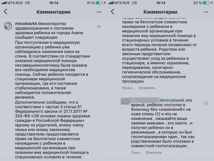 В региональном Минздраве уже отреагировали на случившееся, чем вызвали ещё большее негодование у родных малыша. Там сообщили новую версию о причинах появления ужасных ран на теле Лёши: "При поступлении в медучреждение у ребёнка уже наблюдались изменения кожи на спине". В министерстве отметили также, что за гигиеной маленьких пациентов в больнице должны следить их родные, опустив тот факт, что этим родным просто не позволили остаться рядом с мальчиком.
