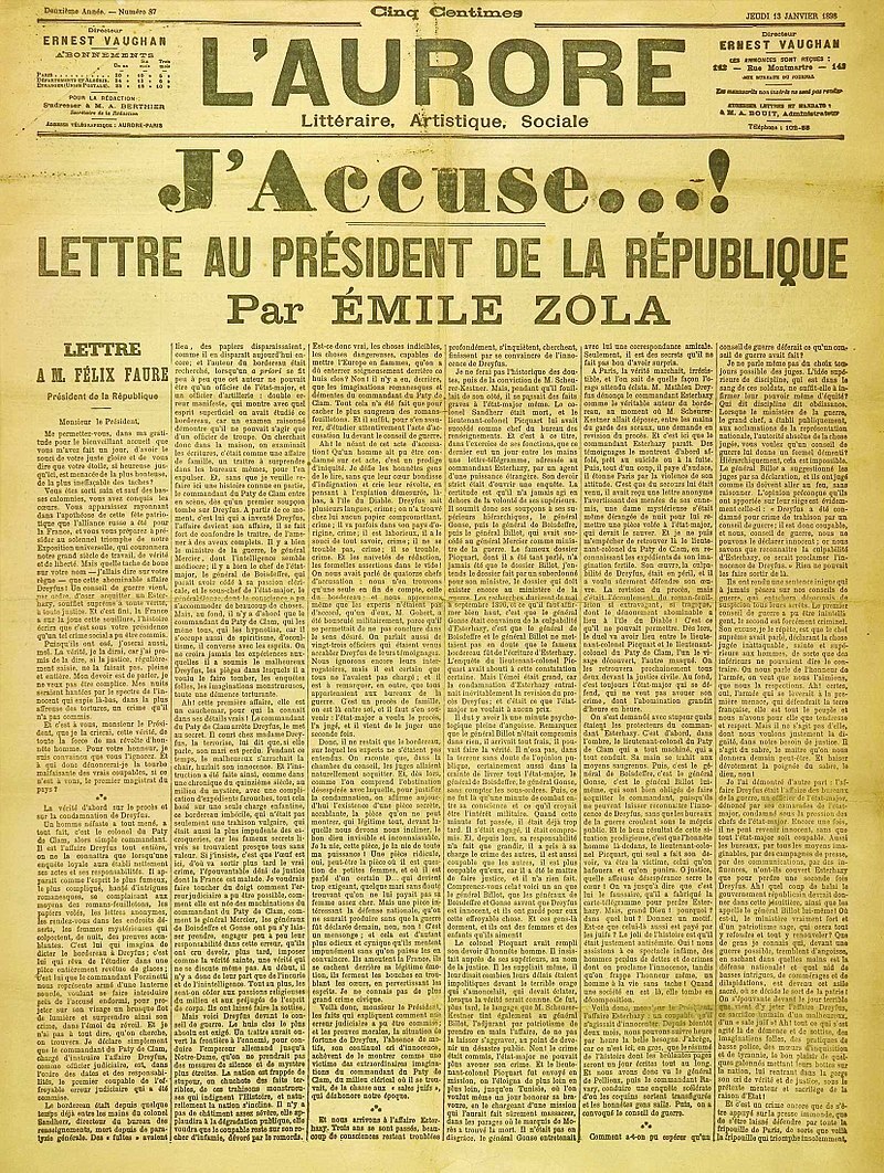 13 января 1898 года французский писатель Эмиль Золя послал открытое письмо (известное под названием «Я обвиняю») французскому правительству по поводу дела Дрейфуса. Статья обвиняла власть в антисемитизме и противозаконном заключении в тюрьму Альфреда Дрейфуса. Золя указывал на предвзятость военного суда и на отсутствие серьезных улик.