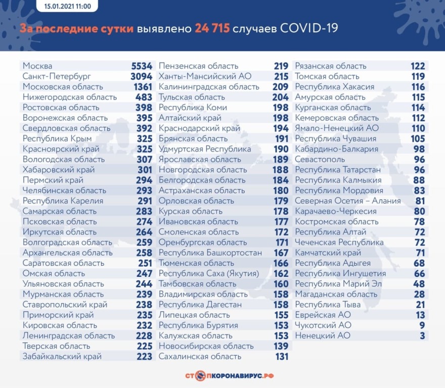 За последние сутки по состоянию на 15 января 2021 года в России:
