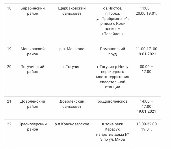 В Новосибирской области в преддверии православного праздника проверены и определены 22 места для проведения крещенских купаний, два из них в Новосибирске. На каждой купели организованы дежурства специалистов всех необходимых служб, в несанкционированных местах запланированы патрулирования водных объектов силами правоохранительных органов. Жителям области рекомендовано соблюдать не только традиционные меры безопасности, но и социальное дистанцирование и иные санитарно-эпидемиологические меры.