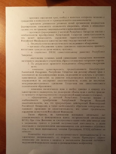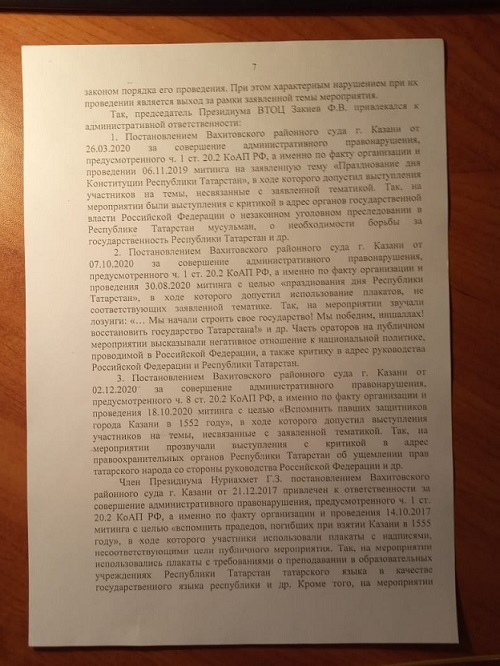 Этому предшествовали активные действия по недопущению проведения активистами ВТОЦ общественных мероприятий, как противоправных, несмотря на то, что они их проводят уже более 30 лет. Сам иск содержит основания, который иначе как нелепым признать нельзя. Потому как в качестве них указывается выступления на митингах в поддержку государственности Республики Татарстан, критика в адрес национальной политики властей и поддержка национального языка и национального образования.