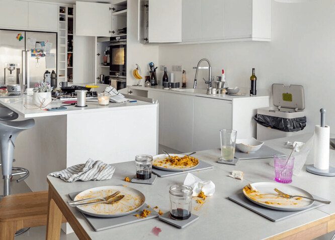 Следующее, что вам предстоит сделать – убрать со столов (да, с них) тарелки и обёртки из-под еды. Всё это может обернуться мусором на уже подметённом полу. А потом начать целенаправленно, как в телефонных играх-квестах, искать мусор по помещению, по полу. Достаточно крупный, чтобы вы могли схватить его руками и отправить в ведро. Во-первых, так вы, ещё не взяв в руки веник, увидите прогресс в уборке. Во-вторых, в крайнем случае вы можете на этом остановиться на сегодня. Уже будет намного чище.