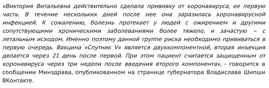 Я впервые за всё время вакцинации нашей российской вакциной от коронавируса "Спутник V" встретила информация о смерти после вакцинации. До этого была всё информация о смертях при вакцинации вакциной Pfizer.