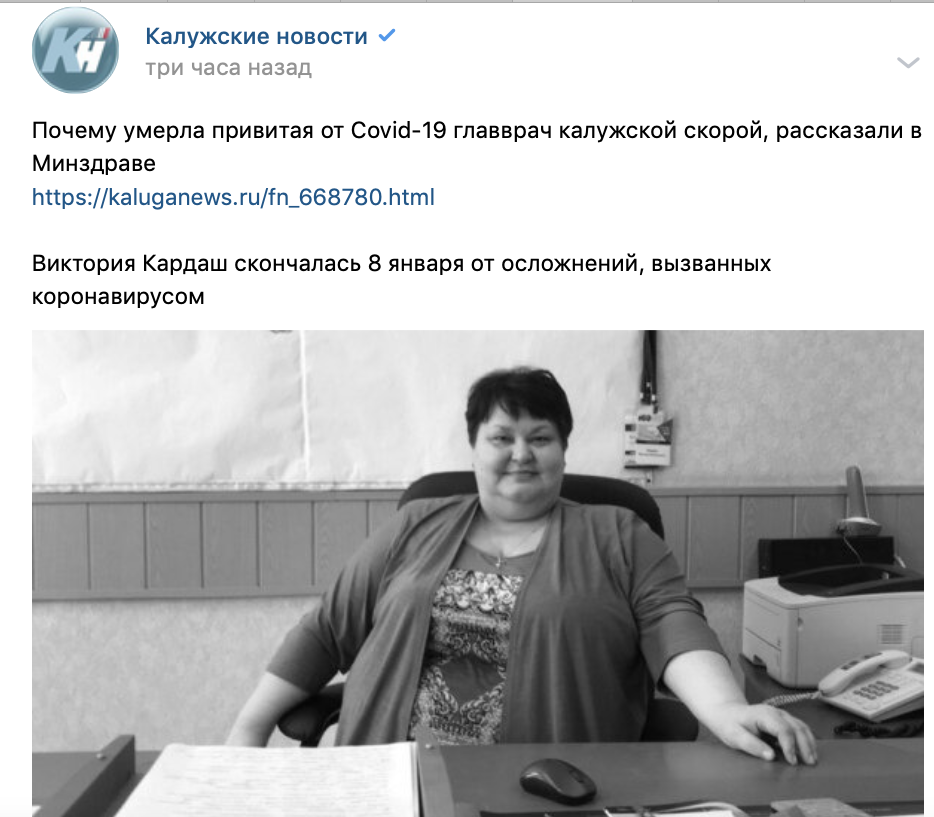 В региональном Минздраве Калужской области официально подтвердили информацию о том, что главный врач калужской скорой помощи Виктория Кардаш за несколько дней до смерти сделала прививку от коронавирусной инфекции Covid-19, однако само ведомство смерть медика с вакцинацией никаким образом не связывает и заявляет о безопасности российской вакцины.
