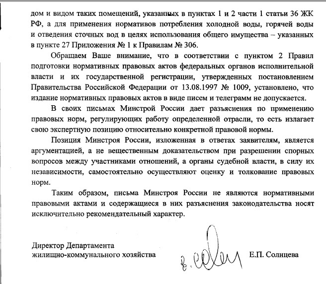 Давайте я приведу ответ Минстроя РФ (выдержку) на конкретный вопрос: почему министерство раньше трактовало вопрос по общедомовому имуществу так, а сейчас эдак. Без изменения в законодательстве. Ответили очень расплывчато. Но главное не в этом. Главное, что написали: наш ответ - не доказательство в суде и суд принимает решение сам, исходя из конкретных обстоятельств. И суд принял решение вразрез с изменившейся позицией министерства. Решение в апелляции устояло стопроцентно. Выдержку из ответа Минстроя публикую.