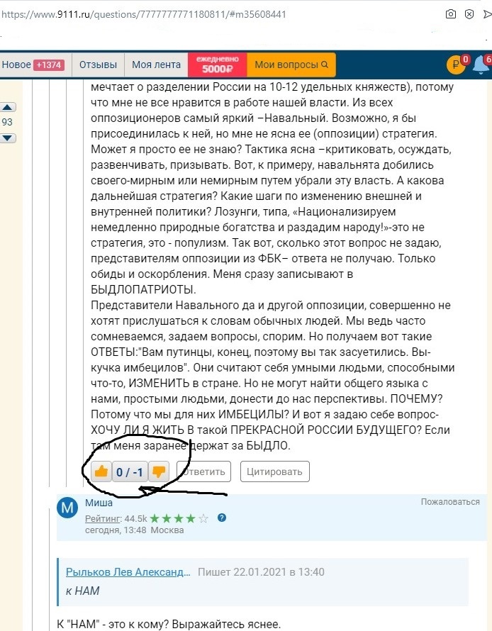 Представители Навального да и другой оппозиции, совершенно не хотят прислушаться к словам обычных людей. Мы ведь часто сомневаемся, задаем вопросы, спорим. Но получаем вот такие ОТВЕТЫ:"Вам путинцы, конец, поэтому вы так засуетились. Вы-кучка имбецилов". Они считают себя умными людьми, способными что-то, ИЗМЕНИТЬ в стране. Но не могут найти общего языка с нами, простыми людьми, донести до нас перспективы. ПОЧЕМУ? Потому что мы для них ИМБЕЦИЛЫ? И вот я задаю себе вопрос-ХОЧУ ЛИ Я ЖИТЬ В такой ПРЕКРАСНОЙ РОССИИ БУДУЩЕГО? Если там меня заранее держат за БЫДЛО.