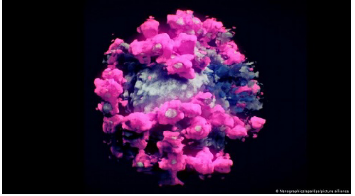 Этот снимок взят из трехмерных изображений реального вируса SARS-CoV-2 из мгновенно замороженных образцов. Они созданы компанией Nanographics, дочерней компанией Венского технологического университета. Они основаны на данных исследователей из Университета Цинхуа в Пекине.