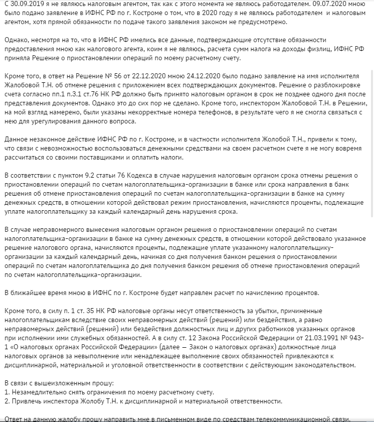 Через пару дней мы посылаем жалобу на имя руководителя ИФНС по г. Костроме, где очень подробно объясняем ситуацию и требуем немедленно разблокировать счет. Вот выдержка из данного документа.