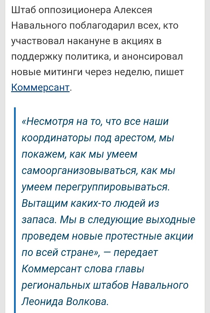 «Несмотря на то, что все наши координаторы под арестом, мы покажем, как мы умеем самоорганизовываться, как мы умеем перегруппировываться. Вытащим каких-то людей из запаса. Мы в следующие выходные проведем новые протестные акции по всей стране», — передает Коммерсант слова главы региональных штабов Навального Леонида Волкова.