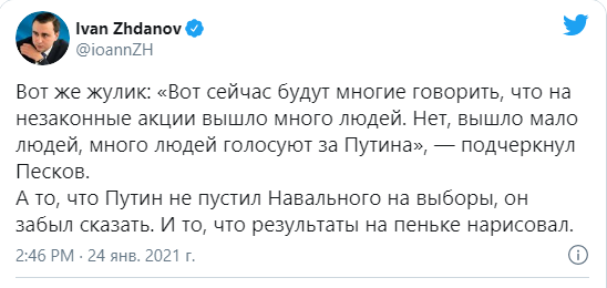 "Сейчас будут многие говорить, что на незаконные акции вышло много людей. Нет, вышло мало людей, много людей голосуют за Путина. И много людей голосовали за поправки в конституцию. Если цифры сопоставить, то поймёте, насколько это мало людей", - сказал Песков на телеканале Россия-1.