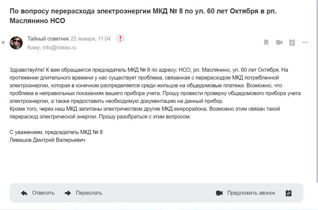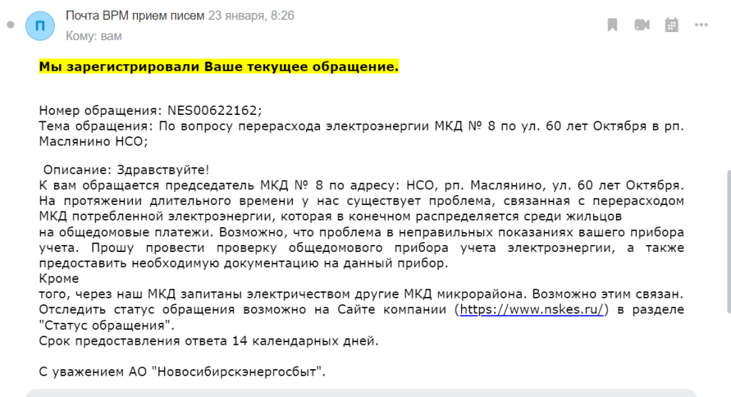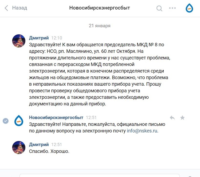 Понятно, что без подключения энергоснабжающей организации нам самим с этим вопросом не разобраться. В связи с чем обратился в электронной форме в «Новосибирскэнергосбыт» через социальную сеть «ВКонтакте» со следующим заявлением.