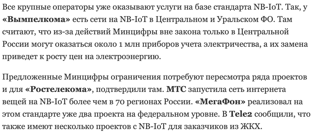 В настоящее время популярный стандарт передачи данных интернета вещей, это не NB-Fi, а NB-IoT (Narrowband Internet of Things). Вот именно популярный NB-IoT и не вошёл в перечень допустимых к использованию в системах и приборах учета электроэнергии.