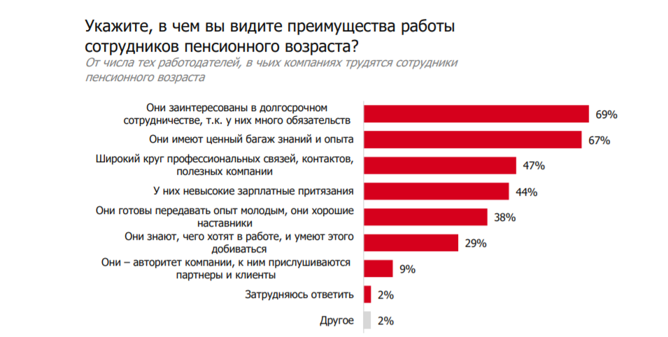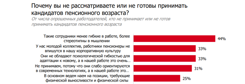 По-настоящему "молодых" по составу сотрудников компаний не так уж много, всего 20% работодателей не рассматривают пожилых граждан на вакансии. При этом лишь 38% работодателей действительно принимают на работу людей в возрасте. В масштабе страны это крайне мало.