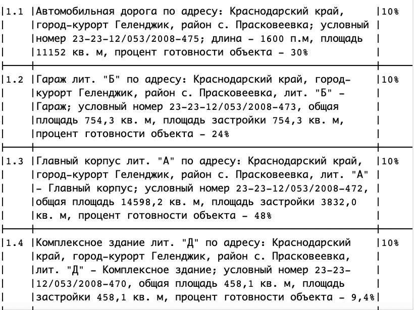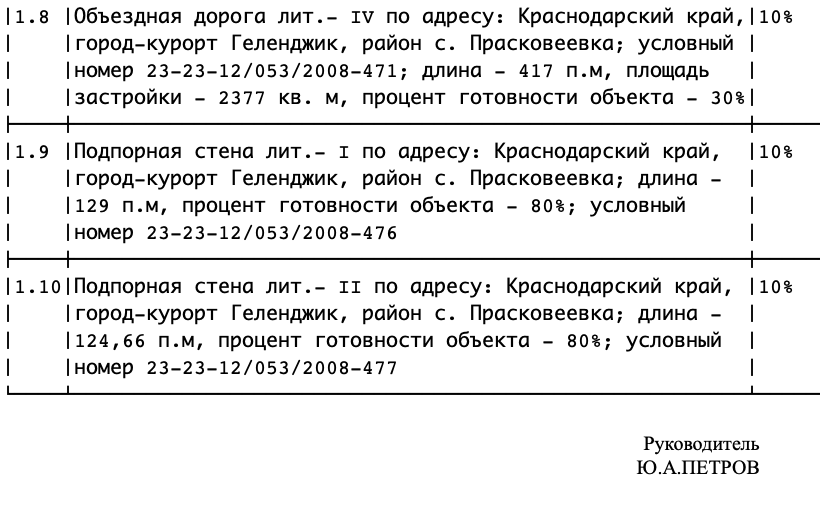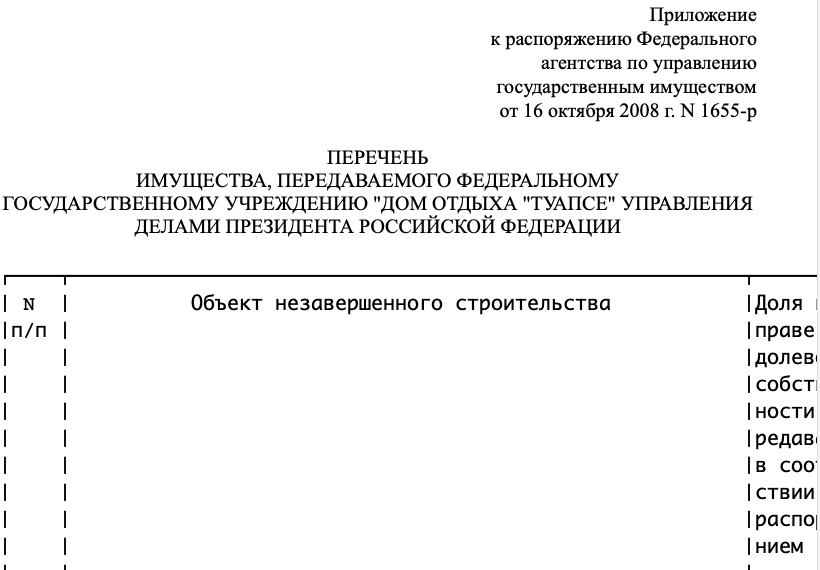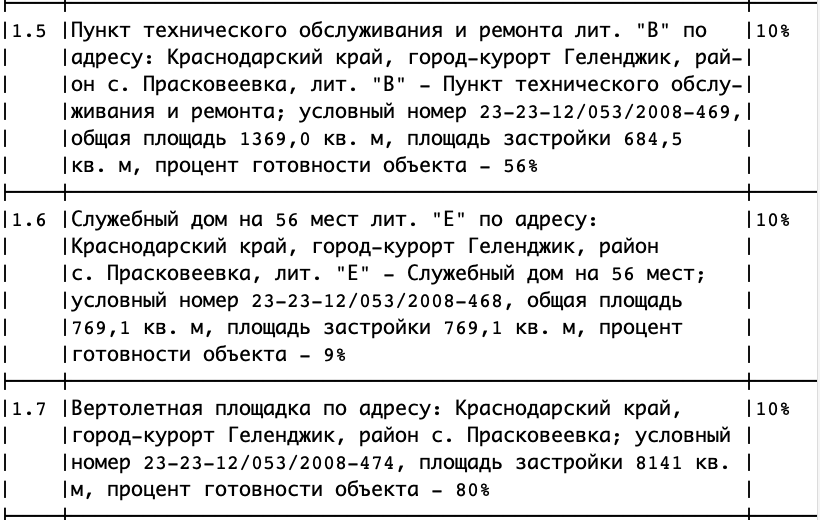 Прошу вас, уважаемые читатели заострить ваше драгоценное внимание на адрес этих объектов. А именно: Краснодарский край, город-курорт Геленджик, район с, Прасковеевка... Далее, обратите внимание на пункт 1.3 приложения к данному Распоряжению: Главный корпус литера "А"... общей площадью 14598, 2 квадратных метров... Ничего не напоминает? И это в 2008 году, когда готовность объекта всего 48%.